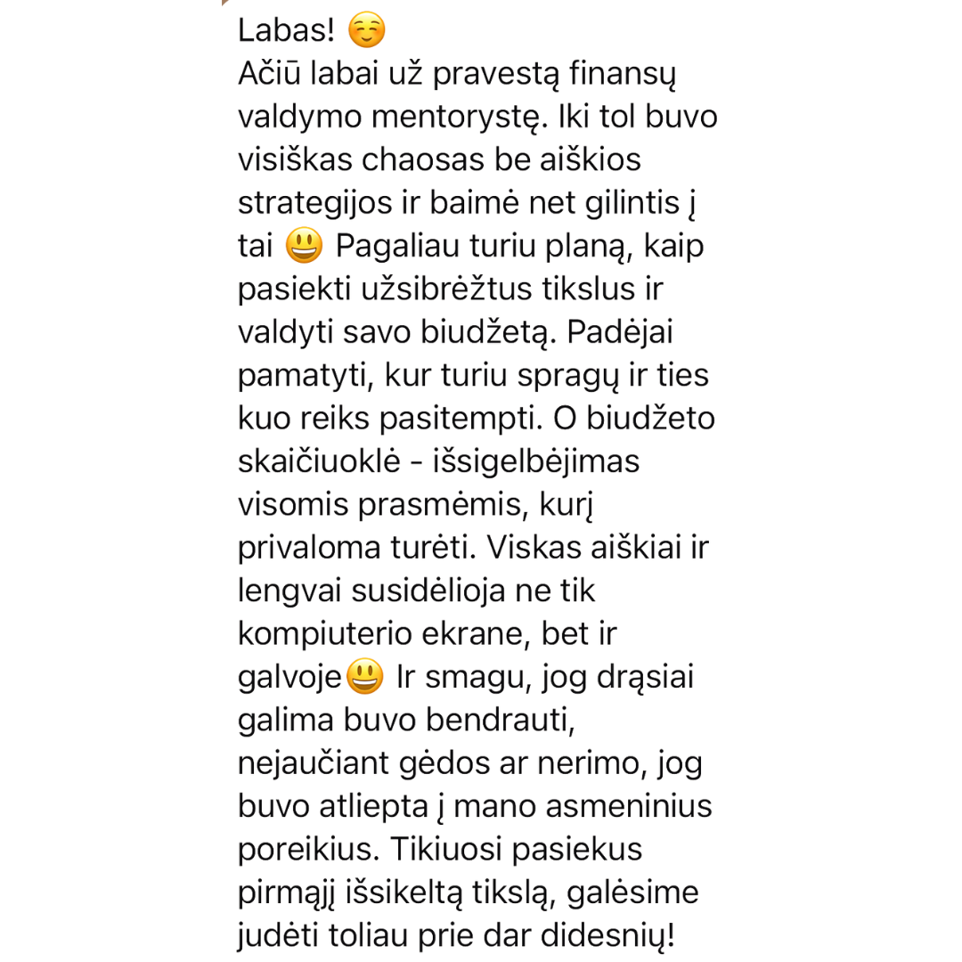 Po mūsų darbo kartu išsineši asmeninę pinigų valdymo sistemą, kurią visada galėsi atsiversti ir koreguoti.