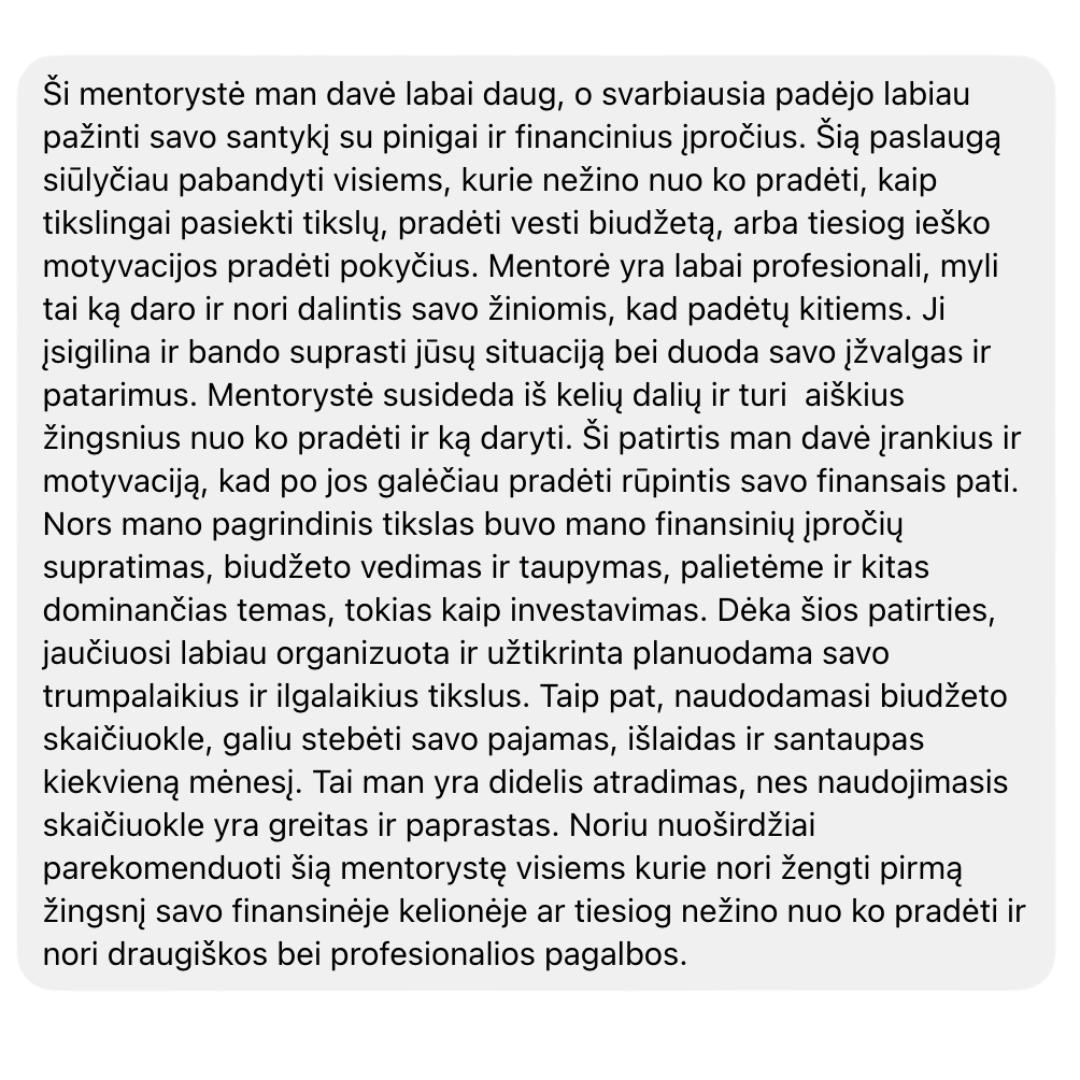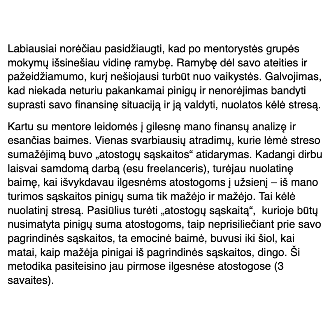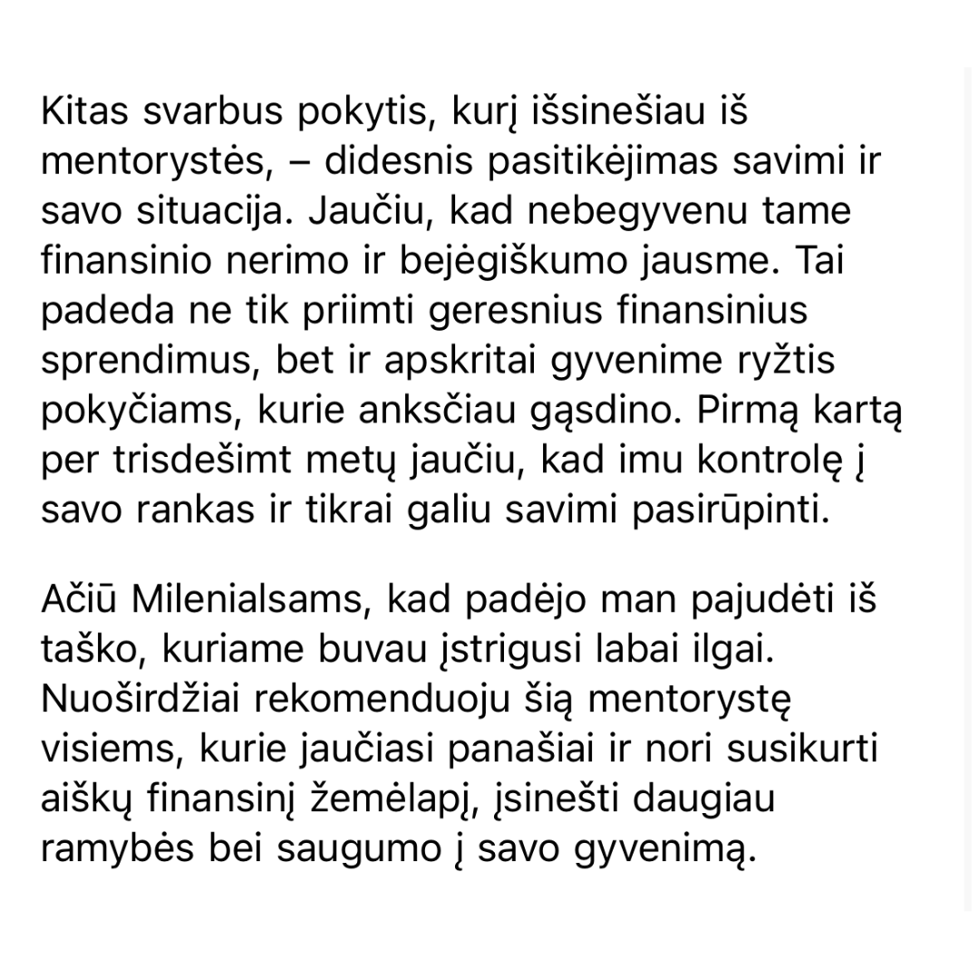 "Jaučiu, kad nebegyvenu tame finansinio nerimo ir bejėgiškumo jausme. Tai padeda ne tik priimti geresnius finansinius sprendimus, bet ir apskritai gyvenime ryžtis pokyčiams, kurie anksčiau gąsdino."