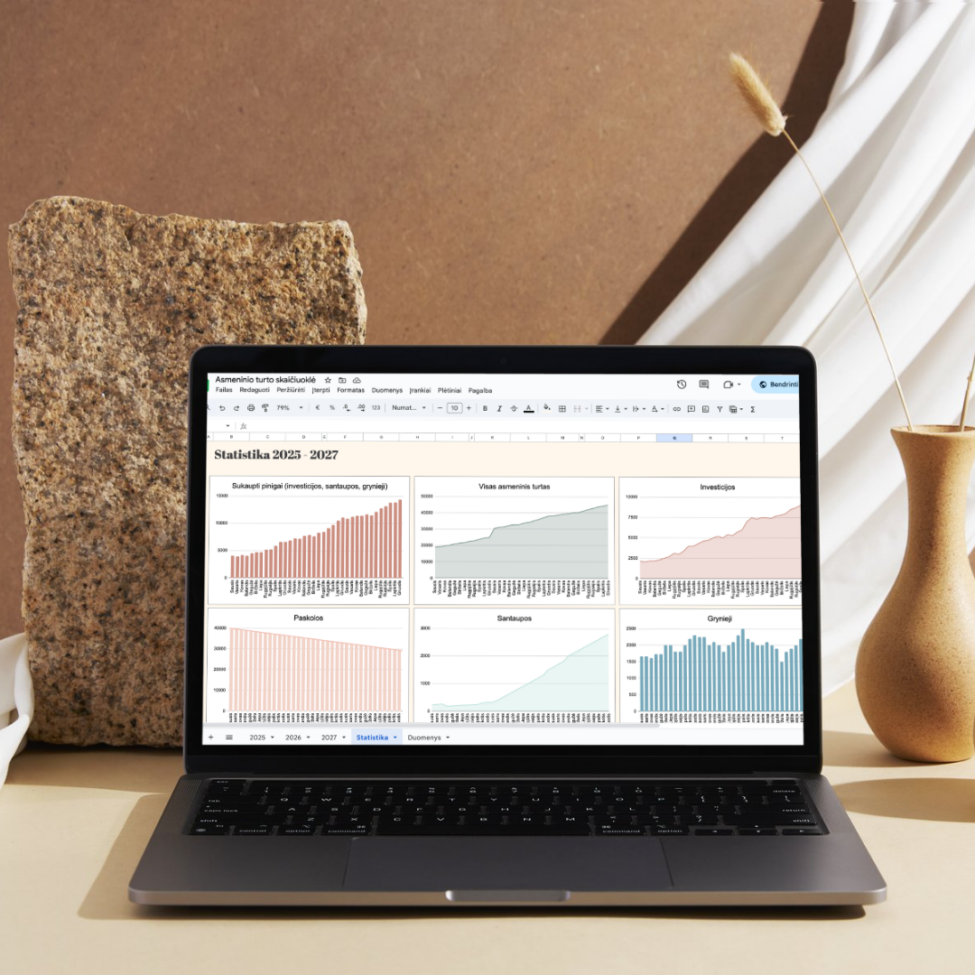 Tai skaičiuoklė, kuri VISKĄ suveda į vieną vietą – kad aiškiai matytum, KIEK, KUR ir KURĮ mėnesį turi pinigų net 3 metams į priekį!