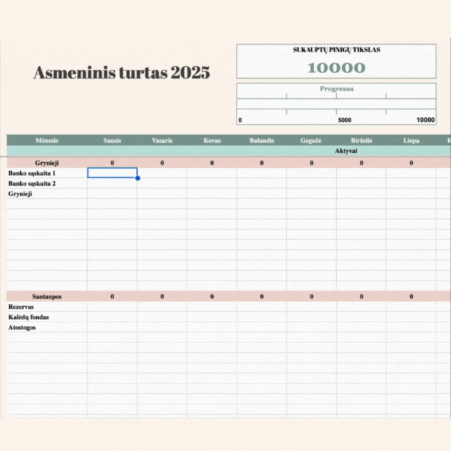 Pasižymėsi kiek nori matyti iš viso sukauptų pinigų, grynųjų, santaupų ir investicijų pavidalu. Taip pat nusistatysi tikslą visam asmeniniam turtui - čia pateks ir kilnojamo bei nekilnojamo turto vertė ir visos turimos paskolos. Kad žinotum kiek ir kur turi pinigų, kuriais gali disponuoti.