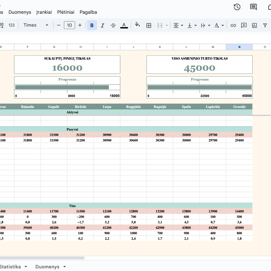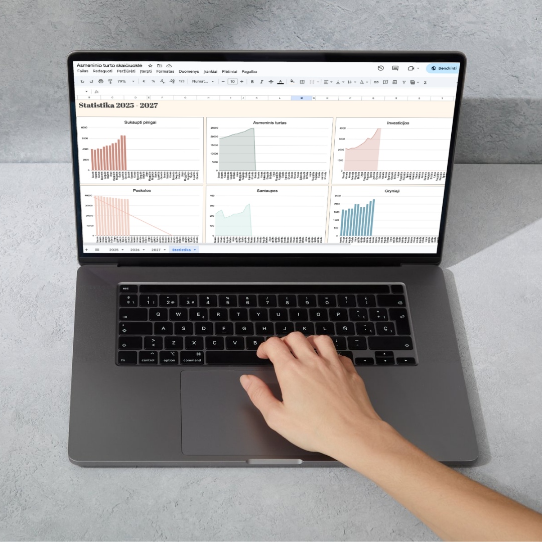 Tai Google Sheets įrankis, skirtas sekti savo finansinį progresą kiekvienais metais. Čia kiekvieną mėnesį žymėsi kiek turi grynųjų pinigų sąskaitoje ir piniginėje, kiek jau sutaupei rezervui, atostogoms ar Kalėdų dovanoms bei kaip auga tavo įvairios investicijos. Taip pat seksi ir savo nekilnojamo ir kilnojamo turto vertę ir progresą grąžinant paskolą.